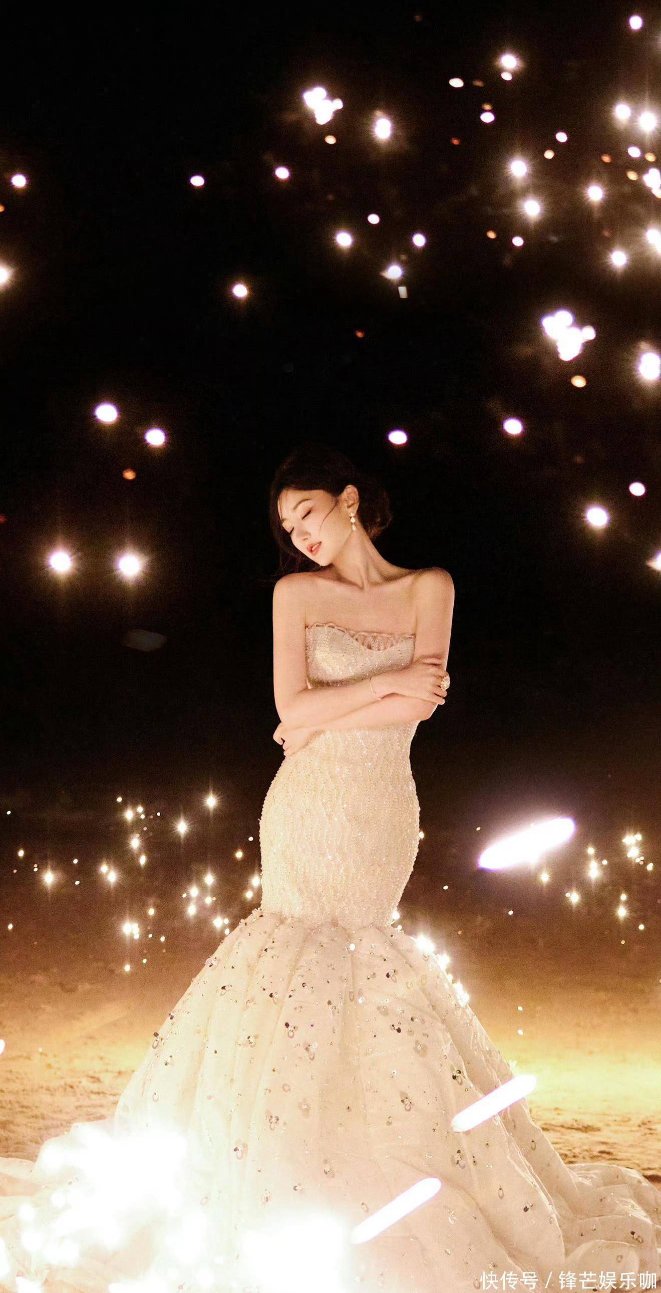 烟花的光焰在她身后次第盛开,暖黄的光晕裹着她,与礼裙的光泽交织,将氛围感推到了极致。这一刻,沙滩、晚风、烟花都成了陪衬,唯有她站在光影里,把优雅与灵动的气质展现得淋漓尽致。